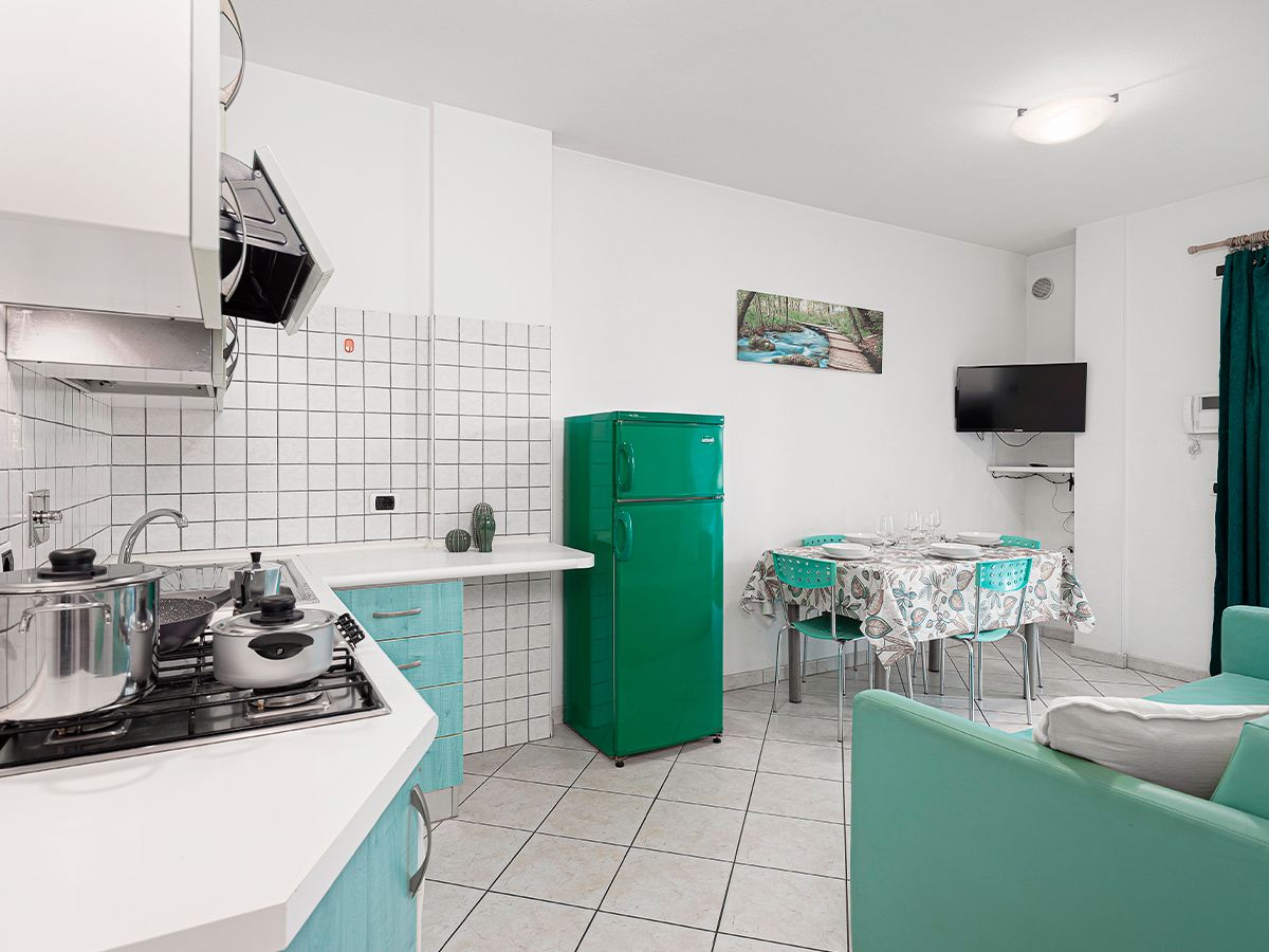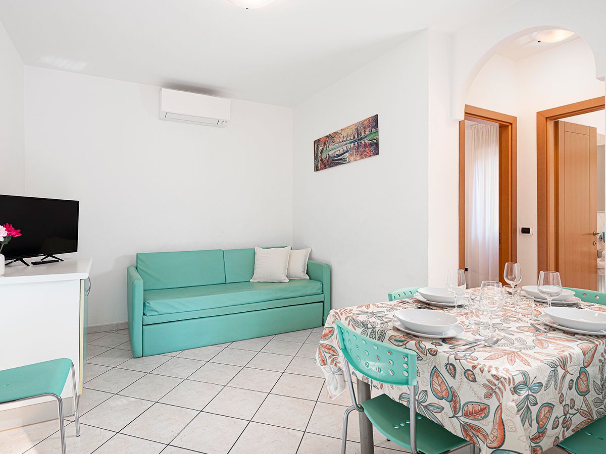 Gli appartamenti vacanza trilocali e quadrilocali presso Residenza Raggio propongono arredi moderni e offrono tutto il comfort alle famiglie grazie ai tanti servizi tra cui: internet Wi-Fi, TV sat, lavatrice, forno, cassaforte, aria condizionata, balcone o ampio giardino privato.